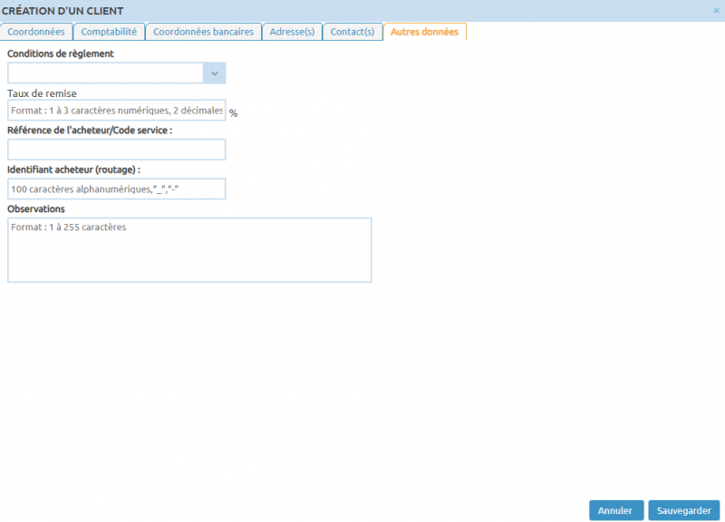 Si vous voulez appliquer des conditions de règlement fixes pour ce client, et/ou appliquer une remise sur tout ses achats, c'est ici que vous devez agir.