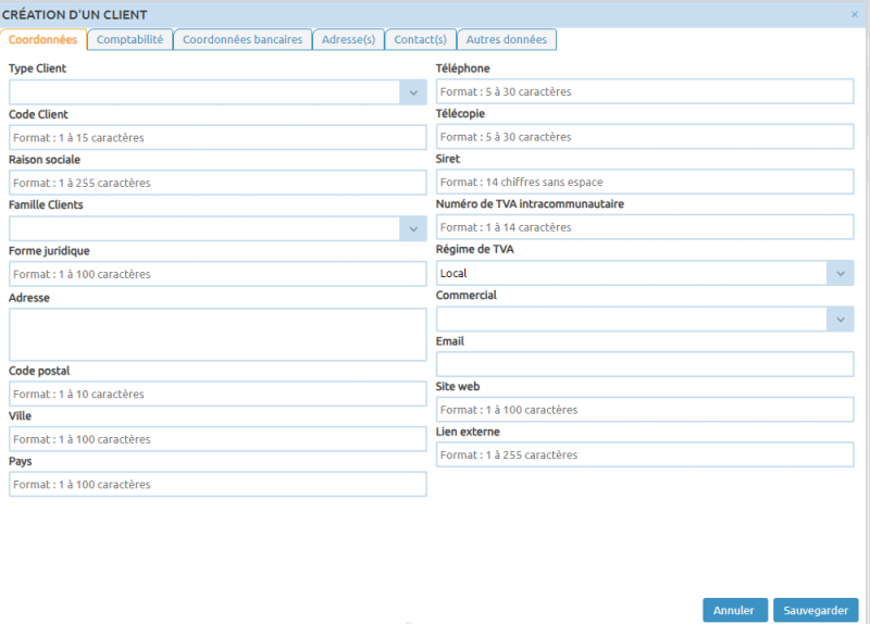 - En double-cliquant sur la raison sociale de votre client, vous accédez à sa fiche.